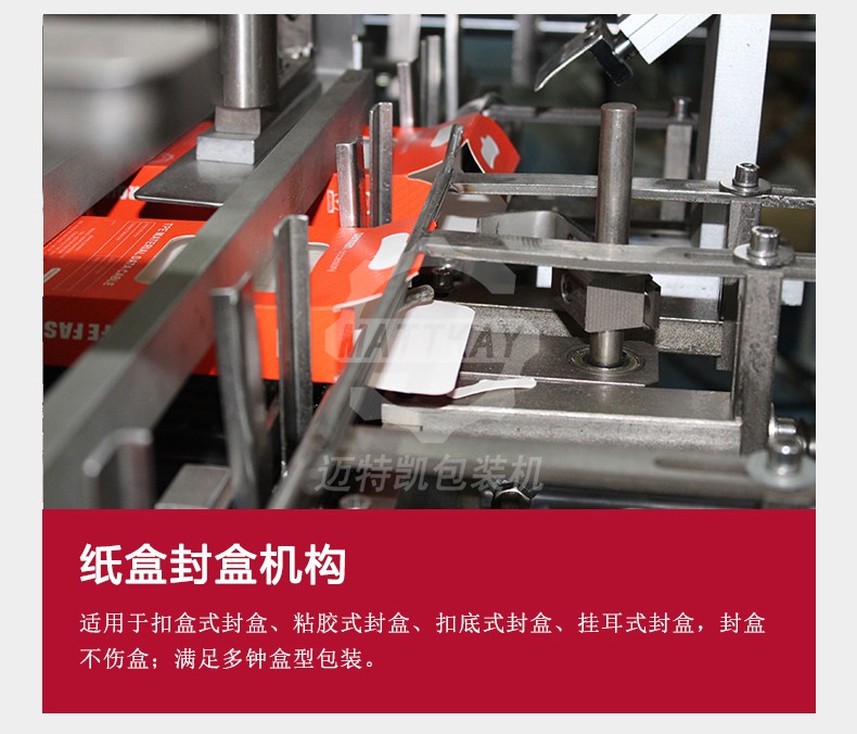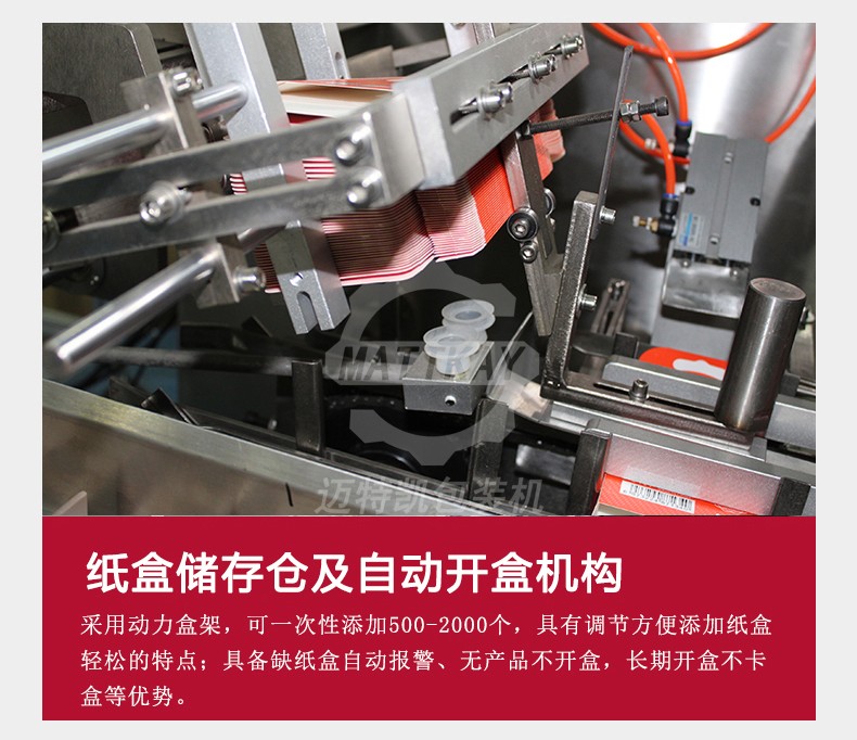 邁特凱月餅裝盒機借助于PLC控制系統和步進電機精確定位,利用氣缸帶動真空吸盤手、推料手臂、折盒軌道等組成一個自動開盒、裝盒、封盒系統。提高了生產效率,節約大量的勞動力,降低企業成本,使企業的自動化程度再次提升,帶來較高的經濟效益。解決很多月餅生產廠家人手短缺、工人易疲勞、勞動強度大、手指易受損傷,直接接觸食品,帶來食品安全衛生問題。